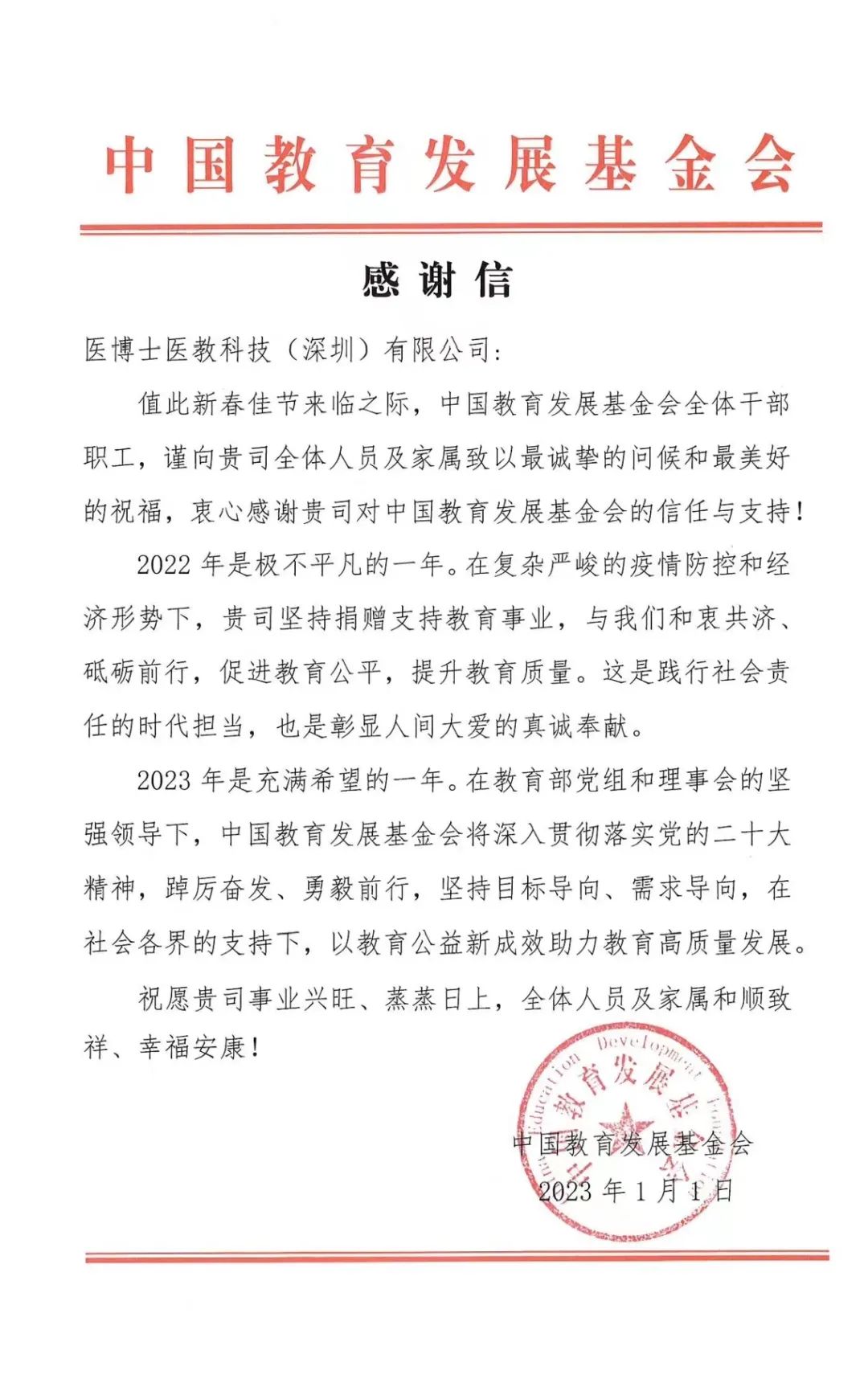 一封來(lái)自中國(guó)教育發(fā)展基金會(huì)的感謝信,醫(yī)博士2022年前行的見證